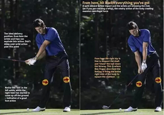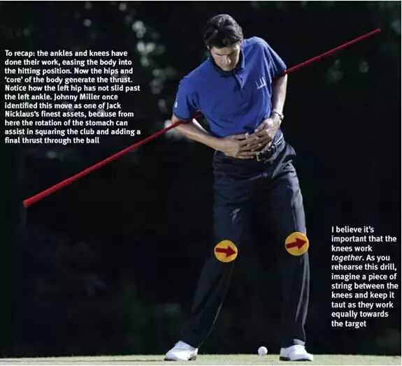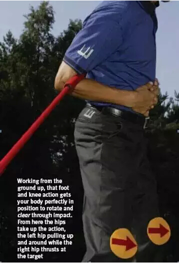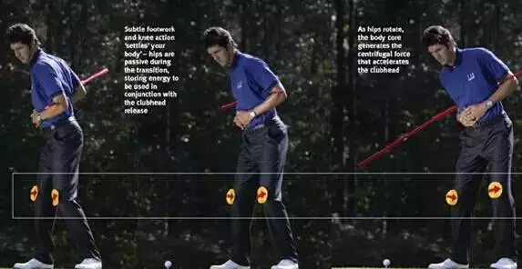 总结一下,从上杆的顶点到下杆的过度过程中,你一直在寻找这样的状态:脚踝与膝盖将身体能量逆转过来(把身体“安置”在正确的姿势上,做好准备用杆头击球)。当左侧臀部得到提升后,你就要用力收回杆柄。高尔夫史上在挥杆方面表现最为出色的球手桑姆-史立德就是因他的“下蹲式”姿势而名扬千里的。接下来臀部会积蓄力量,就像旋转木马的中心一样,目的就是最大限度地利用离心力,以最快的速度将球杆挥上正确的路径。