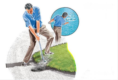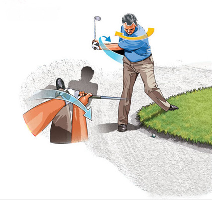 下杆时,假设你正在用右臂将石子扔过池塘打水漂。触球过程中杆面应与右手掌的位置一致——即朝向天空——这样会使杆面倾角最大并驱动球向上起飞脱离沙坑。确保以球杆跟部而非趾部引导,这会使杆头从球下滑过,而不是简单地将杆头挖进沙子。
