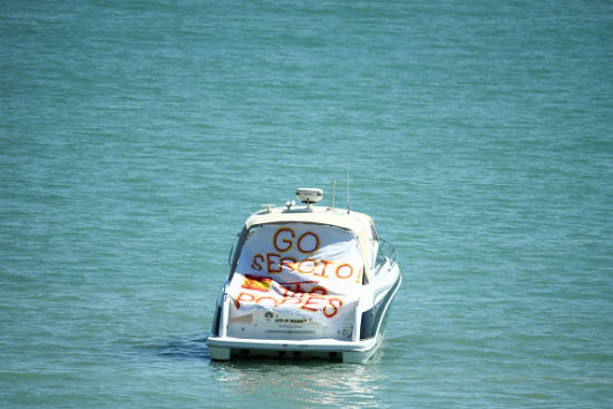 美国PGA锦标赛第三轮练习日,疯狂球迷在密歇根湖驾驶游艇挂横幅支持喜爱的球星加西亚。