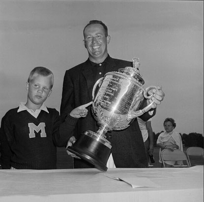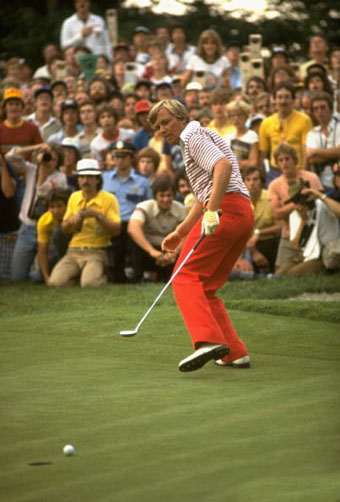 他快速弥补失地。鲍勃-罗斯伯格前九洞打出30杆,最终交出66杆。这是最后一轮的最佳杆数。杰瑞-巴伯在15号洞抓到一只很长的小鸟时看上去还控制着全局。三个帕足以帮助他取得胜利。与之相对,他却吞下两个柏忌,落到了一杆之后。另外,道格-桑德斯(Doug Sanders)在17号洞错过了30英寸推杆,加入杰瑞-巴伯的行列,也拿到亚军。十年之后在圣安德鲁斯,道格-桑德斯错过了另外一个短推,结果输给了尼克劳斯。