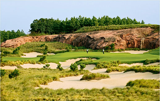 作为一名此前在中国从未有过作品的美国设计师,里克·雅各布森当然会珍惜这个有可能帮助他打开中国市场的良机。为了在狮子湖找到一个能使其脱颖而出的特色,设计师进行了大量的勘探和考察工作。研究了地质之后,雅各布森惊喜地发现,狮子湖这片土地上蕴藏着巨大的丹霞景观。18洞球道由此在巨大的红岩之间穿梭布局。