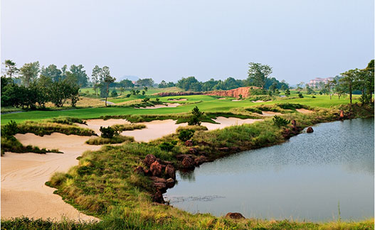 清远狮子湖乡村俱乐部所在的土地上虽然原来就有座球场,但除了保留个别一两洞的洞线外,球场完全是重新修建的。新的狮子湖集壮观的红岩、郁郁苍苍的松树、大小不一的传统沙坑以及狂野的长草元素于一身,是一座极具视觉享受和击球策略的林克斯风格球场。