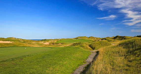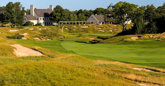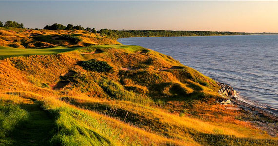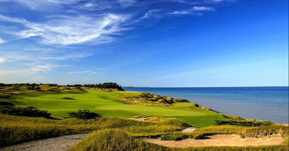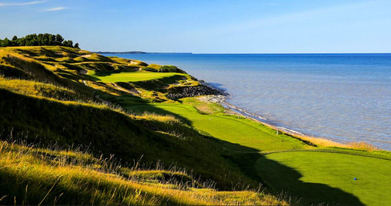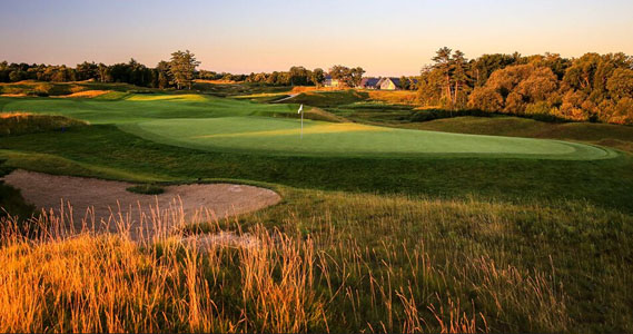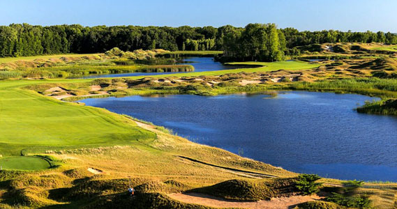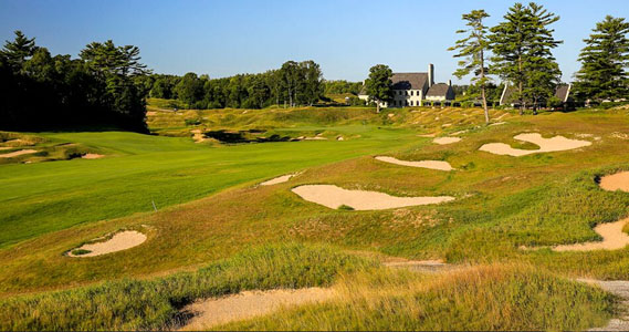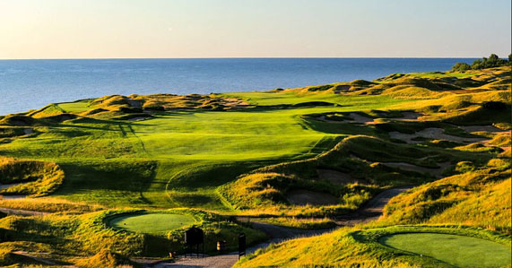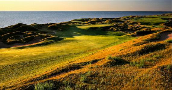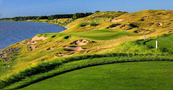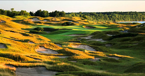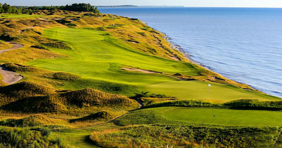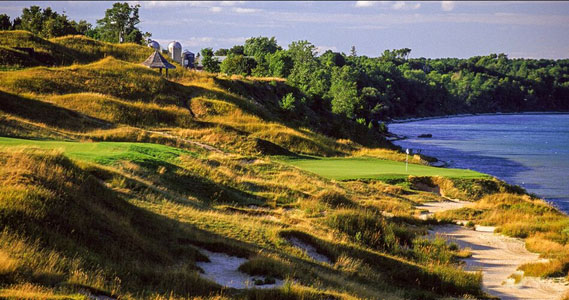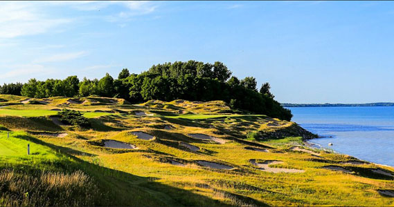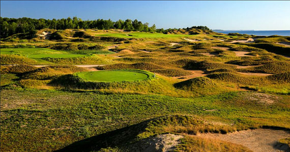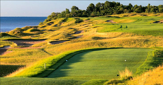 果岭左边是密歇根湖和深深的沙坑与沙丘。小球只要落在果岭右边的中段,都会很快的滚向左边。