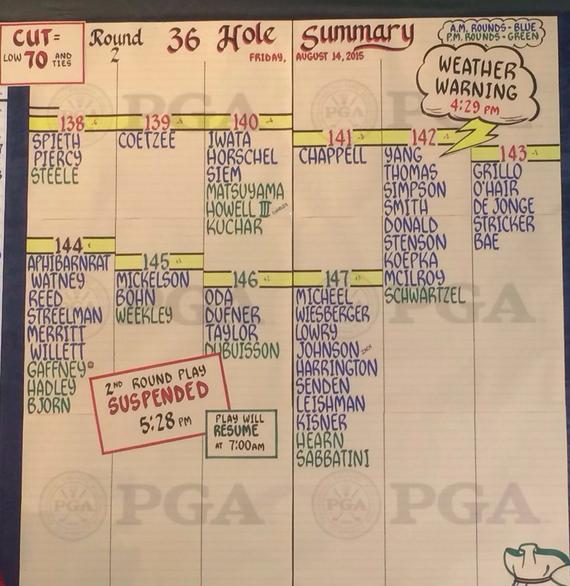 在恶劣的雷暴裹挟着大雨以及50英里/小时的大风袭击呼啸峡之前,球员们已经离开了赛场。第二轮将在星期六早上东部时间7点恢复,预计第三轮将在第二轮结束之后30分钟开始。离开赛场的时候,简森-戴伊还剩下4个洞,他在前14个洞抓到6只小鸟,包括转场之后连续三只小鸟,当日成绩为低于标准杆5杆,而总成绩为低于标准杆9杆。