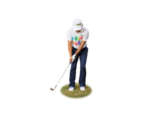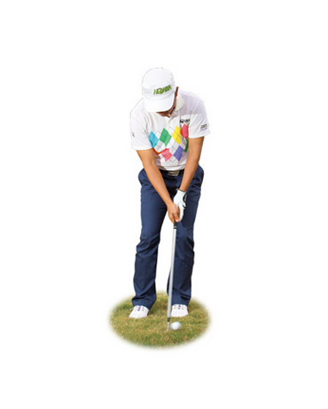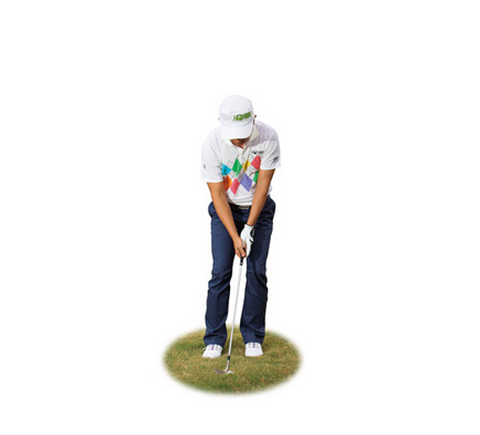 拿出杆面角度较大的挖起杆,如56度或58度,接着做出和推杆时相同的瞄球设定,包括握杆、站姿与摆球位置(约在双脚中央),但是让杆头悬空,将杆面前缘对準球的赤道线。这么做能避免杆头往下挖,被草茎绊到。