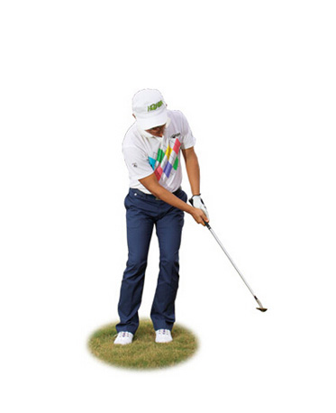 触球瞬间是以杆面前缘碰触球面,所以你会有点好像打得不是很扎实的感觉,这样没错。球还是会稍微跳起,然后在柔软落地后往前滚动一段距离。