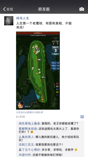 在和高球好友相聚时,更少不了拿出各自的沙盘图片切磋交流,想要在朋友圈里炫耀一下自己如有神助的发挥,只要轻点“分享”,就可即时更新至朋友圈、新浪微博等热门社交软件。一个高尔夫玩家的朋友圈,没有一幅属于自己的沙盘图,又怎么会有说服力呢?