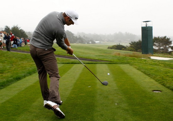 ● 下杆时,感觉像是身体渐渐慢了下来,使得杆头能够先到达球所在处。触球后杆头继续运动,到达身体前方。