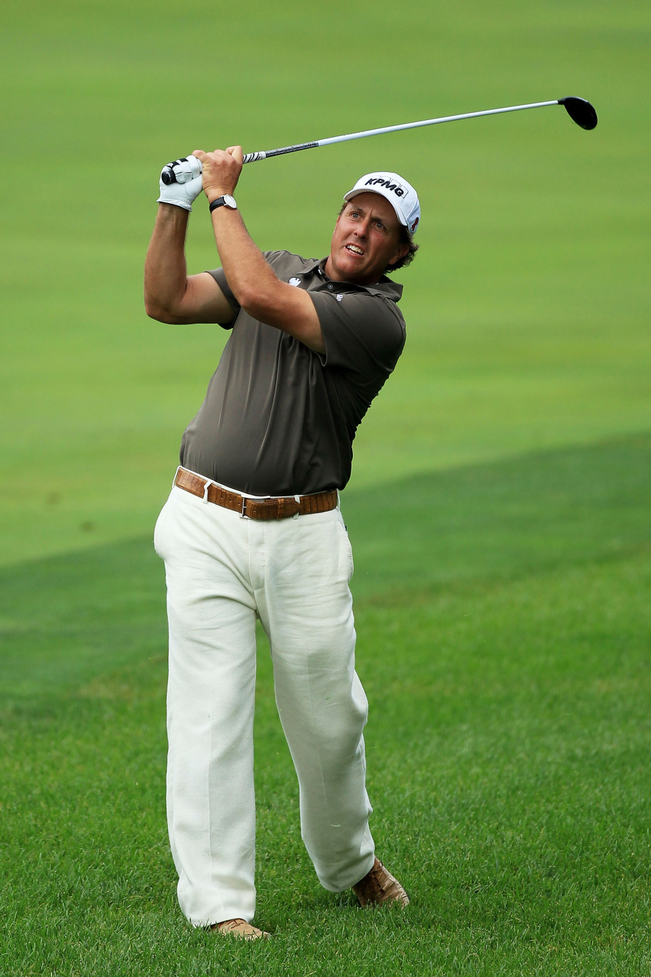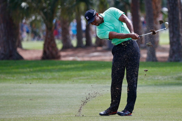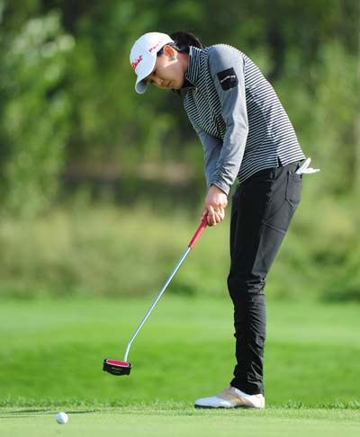 2.挥杆。比赛前去练习果岭,找几个不同的球洞,仅用右手握杆练习推击,以加强对距离控制的感觉。注意体会你的手臂和击球是如何完全被杆头的重量所控制的。击球过程中你的前臂应该有一定的转动,手腕先翻转再反向翻转,以增加击球力量。你也可以在球场上用这种击球代替标准击球。