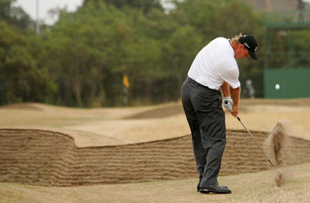 打法:此时应使用比以往面对这种距离时长2号的球杆。握杆时双手下移,接触到杆身,这样更容易控制速度。你的挥杆轨道应比以往更平,因此在上杆时和顺势动作中都不要使双手高于肩部。触球时,将胸部转至球前方,做出扫击,使球从地面飞起。做出这些调整是为了降低你的挥杆速度,避免向下击打,那样的话球就会高高飞起。超慢的挥杆速度,加上较平的挥杆轨道,将使你打出凌厉的低飞球,在风中杀出一条道路。