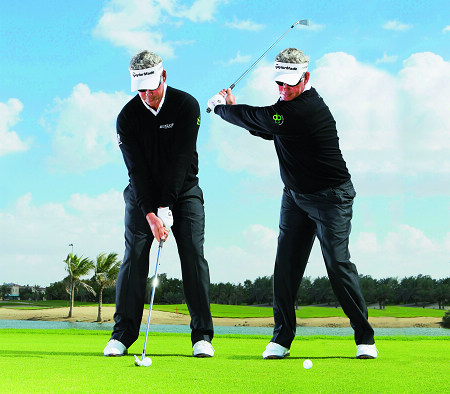 ● 做几次练习半挥杆,触球后使球杆停在还原动作完成时的地方。杆头应该处于双手前方,杆面指向目标左侧,右前臂转至左前臂上方,就像是左手要扭转方向盘一样。