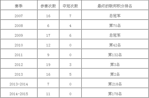 伍兹近几年赛季的综合情况: