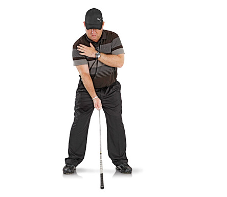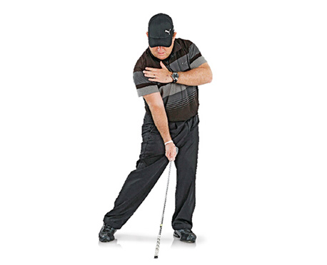 2. 做出单手上杆。感觉你的左肩由右膝上方经过。使右臂保持在胸部前方。