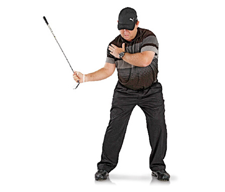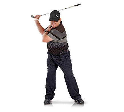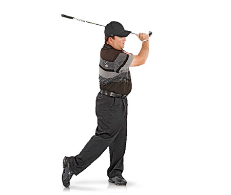 5. 右肩加速通过触球过程(利用左手的推力提醒自己使右肩保持转动),做出平衡的收杆。收杆时,胸部朝向目标,重心置于左侧身体。