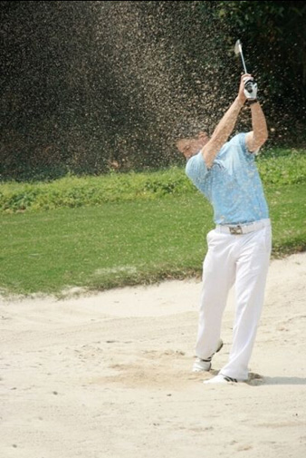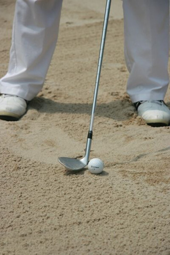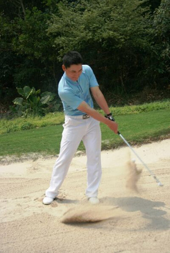 第二, 想要打好沙坑球必须要具备好的站姿:两脚要与肩同宽并将两脚陷进沙里,这样可以增加挥杆的稳定性,握短球杆,双手轻压握把上,站位打开一点点,重心在前脚掌,60%的重心在左脚,40%的重心在右脚(右手球员),如有需要可以打开杆面,做到这几点之后你就为完美的一击做好了充分准备,关于挥杆击球你也许会觉得很难,其实你只需要做好了全挥杆然后击打球前3英寸处的沙就好了,这样就很轻松的能把沙子和球一起打上果岭。注意在收杆时双手应该位于左肩的上方,让身体正对目标方向,在击球后做好完全收杆动作非常关键,因为它可以使杆头在通过击球区时保持速度大小不变,而业余球手最容易出现的错误就是怕把球打过而减速,结果却是打完后球还在沙坑。所以在打沙坑球时一定要完全收杆,只有这样才能产生足够的速度与力量使球飞出沙坑。
