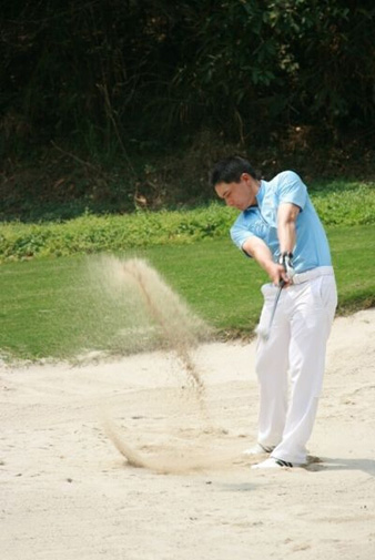 1、站在沙坑里按照上面所讲的做好站位,空挥杆不打球只是击打沙,一定要全挥杆并且要把沙打到旗杆的地方,刚开始时你甚至会感觉很难将沙打上果岭,经过多几次全挥杆练习之后你就能很轻松的把沙打到旗杆了,然后再把球放进沙坑,做好站姿和刚才击打沙时的挥杆时一样,只是想像要把沙打向旗杆就好了,经过爆炸式的一击后,球就会和沙一起飞向旗杆,这时你会发现原来打沙坑球是可以这么简单的。