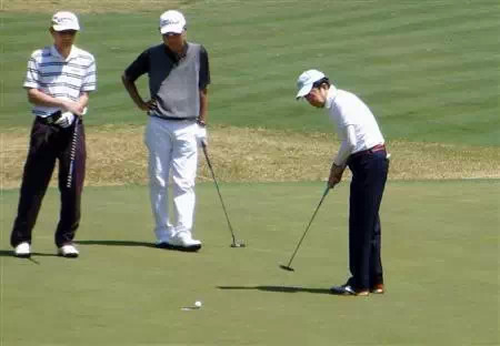 有些老板打球,挥杆姿势难看,打出的球不是左曲就是右曲,没关系,你站歪点儿不就可以校正方向了吗?