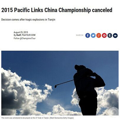 美巡赛官网上发布消息,称因为天津爆炸事故灾难,故决定取消在中国举办的2015太平洋联盟中国冠军锦标赛。该项赛事是美巡赛一级赛事首度引进中国。