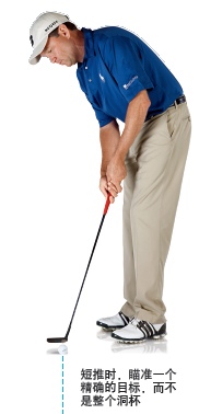 有趣的是,面对5英尺内推击时,我不会注视洞杯本身。相反,我喜欢选择一个非常小的、精确的目标,比如洞杯后部的一个泥点,或者洞杯后方的一根颜色有点黄的草。把注意力放在一个小目标上,有助于我保持专注,做出充满信心的推击。