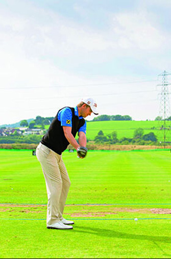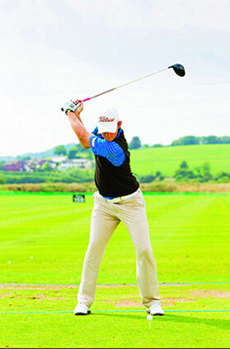 确保双臂放松,且握杆力道适当,如此才能沿着平面上杆,创造最大的力量与杆头速度,同时能够感觉杆面在挥杆过程中的位置。