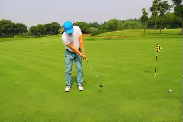 有一种错误观点认为,推杆时要保持上杆和送杆的长度不变,无论你想推出多远的球,只需调整自己推杆的力度即可。但事实上,这样的做法会带来多余的手部动作。因此,一定要确保充分的上杆距离,这样,无须手部动作就可以保证杆头逐渐加速。想象球正好位于杆头运动的路线上,是杆头自然而然地遇到它,而不是你有意识地去击球