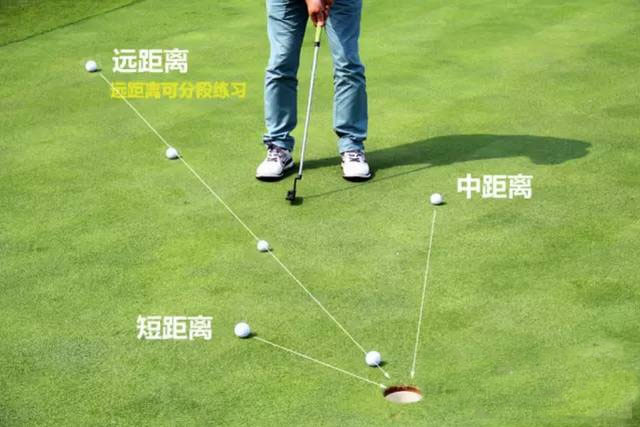 从三种不同的距离开始进行推杆距离练习。如果你能养成良好的习惯,将一个远距离球分成几段短距离球的话,那你打起球来就会更加轻松