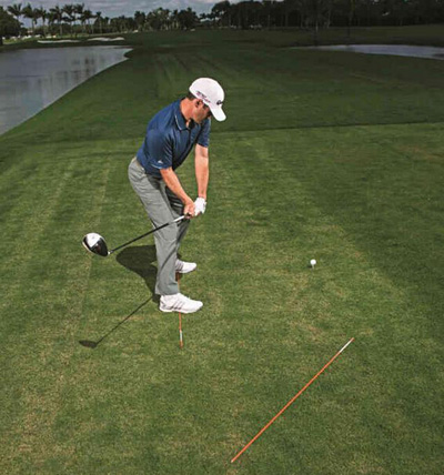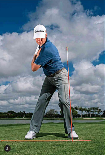 首先,拿两支瞄准辅助杆,第一支放在脚下与目标线平行,第二支放在球后与目标线呈45度(上图)。常规定位,上杆至顶点。然后,下杆到一半,让肩膀连线与第二根杆指向一致。这可以让身体保持关闭状态,从而带来由内而外的挥杆路线——这正是小左曲击球第一步。