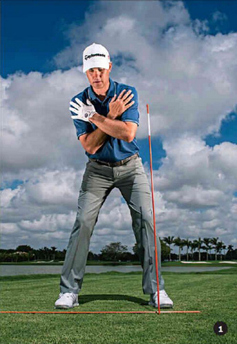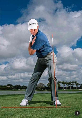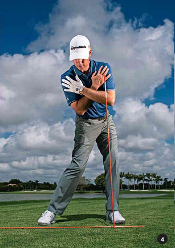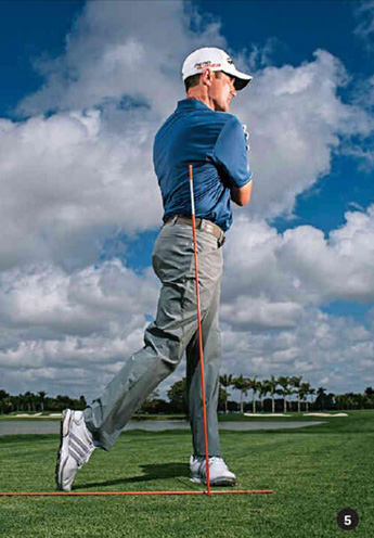 为了让你的肩膀在下杆时更容易保持与目标线呈45度状态,可以试试下面这个练习方法(图1至图5)。