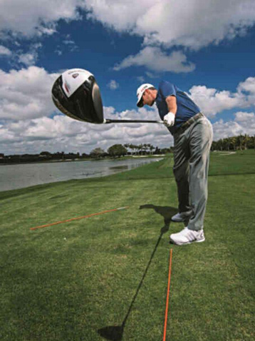 在随挥过程中,当杆身与地面平行时,杆面指向应该垂直于第一支杆(上图)。左臂的这种逆时针转动可以保证杆面相对挥杆线路稍稍关闭,从而打出小左曲。