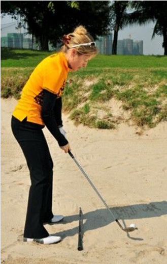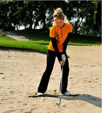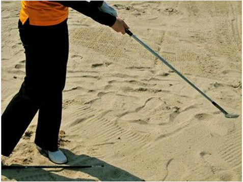5、顺着沙坑的表面去挥杆,不要企图用杆面去捞球。