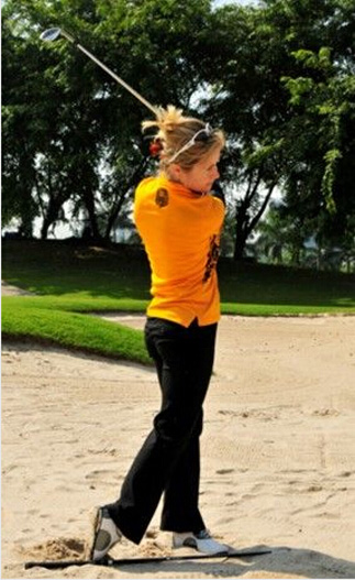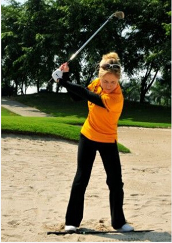 如图所示,想要完美的救出在沙坑里面的小白球,就必须要有一个完美的挥杆,首先,在你的上杆过程当中,你一定要避免身体重心转移至右脚,为了你 能顺利的救出小白球,请不要让你的左肩轻易的向右倾斜,身体的重心一定要放在前脚上。事实上,当你有了这么一个正确的上杆的时候,你的下杆也渐渐的趋于完 美。