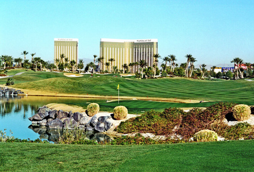 它的独特之处在于:仅仅几步之遥就能让客人远离拉斯维加斯式的都市繁华,进入一个充满热带海洋风情的高尔夫天堂,那种空间转换感十分奇妙。巴厘海球场在五光十色的主题酒店中鹤立鸡群,以金碧辉煌的曼德勒湾(MandalayBay)酒店做背景,世间罕见。为了营造独特的效果,开发商砸下了巨资,精心营造了近3万平米的人工水域,而一般标准的18洞球场占地也不过60万平米左右。此外,球道中巧妙安置了8组让人挠头的水障碍。还移植了4,000棵棕榈树和10万多株花草,还有价格不菲的黑色的火山岩和白色大理石,烘托出一种南太平洋的气氛。球场看似华丽与流畅的球道隐藏了相当巧妙的难度,总在不经意间就给人温柔一刀。看似点缀的水障碍、攻果岭时的路线,以及果岭与沙坑的位置搭配,是这座球场极富魅力的三大挑战。