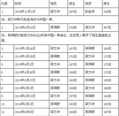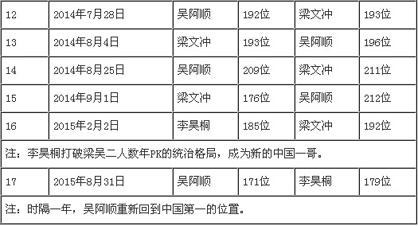 中国一哥的争夺一直没有停歇过。2004年11月1日,梁文冲取代张连伟成为中国一哥。八年后,吴阿顺击败梁文冲,当上了中国第一。之后几年时间里,二人交替登顶。直到今年2月2日,小将李昊桐打破二人的PK格局,成为新的中国一哥。