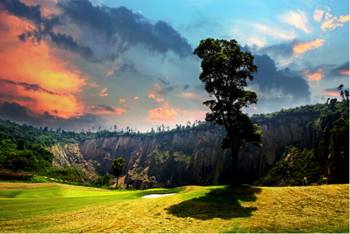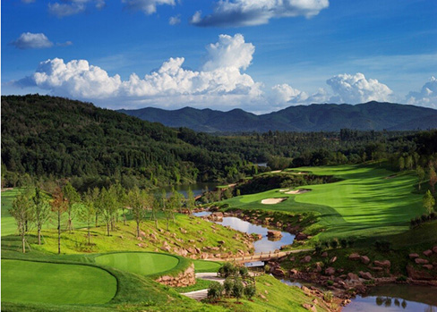 球场是由世界知名的美国史密特·科里设计公司的主创李·史密特先生亲自精心设计的山地高尔夫球场。球场四周峰峦叠嶂,树木苍翠,设计依山势起伏,保留了自然的地势景貌;利用天然形成的岩石 、丛林、湖泊等成为球道上的天然障碍区和球场景观点缀,让整个球场拥有美不胜收的景色。同时球场具有高难度的挑战性,球道跌宕起伏、变化丰富、高地落差大、球道坡度大,又有沟壑,山谷,湖泊相间,增加了挑战的趣味和难度。