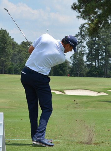可以看到库查尔的击球有多扎实,球已经飞出,但杆头继续扎进地面,这也是为什么高手能够在击球后铲起草皮。除了保持头部位置固定外,注意库查尔的右脚,他的右脚踩实地面,后脚跟没有抬离地面。有一种说法是,在触球时保证右脚不离地,既能保证更稳定的身形,同时能够在身前让出更多的挥杆空间。