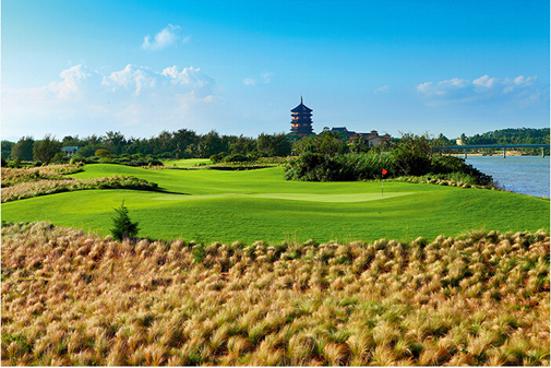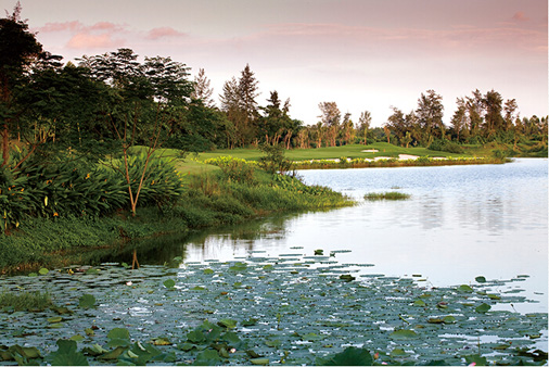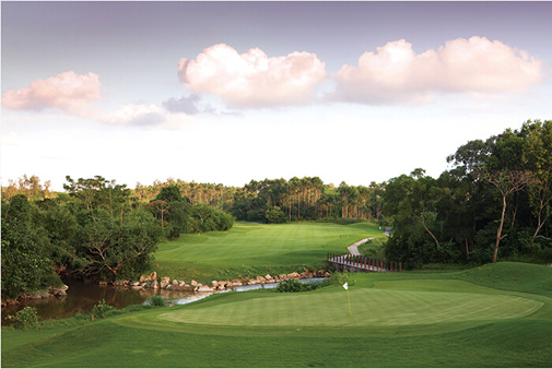 第9洞和第15洞像是一对孪生兄弟,球道右侧一直有水相伴,且球道狭窄。第16、17、18洞是连续三个主打水障碍球洞,却各有特色。第17洞是距离不长的三杆洞,只有153码,却困难重重。首先,开球要越过正前方大片水域;其次,击球距离和方向要控制好,果岭左右两侧和后方都有让人无法补救的障碍。这一洞是见识南洋河野性的一洞,如果没有发球台和果岭,我们用肉眼无法辨认出这是高尔夫球场。
