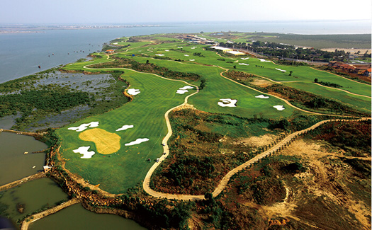 儋州古盐田球场9条球道环海,全长7461码,地貌为亿万年前火山喷发所形成的自然地貌,球场周边约有5公里长海岸线,打球全程都有海风吹拂。除了壮观的海景,球场还有以自然裸露强风化玄武岩为景观,并有15万平方米红树林等自然风光。整个球场的草种为海滨雀稗,常年平均温度保持在24摄氏度左右。