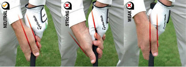 握杆时力度不要过大,就像本·霍根曾经说过的:“像手里放了一只幼鸟一样地握着球杆。”一般来说,握杆时用力过大(上图左二)会造成左曲球,而球手往往会在击球时为避免打出左曲球去调整姿势,从而打出右曲球。而如果握杆力度过小(上图左三),就容易打出右曲球,而为了避免打出右曲球,球手调整动作可能会产生左曲球。不管怎样,如果在开始时动作就是正确的,就不需要在挥杆过程中不断调整姿势了。
