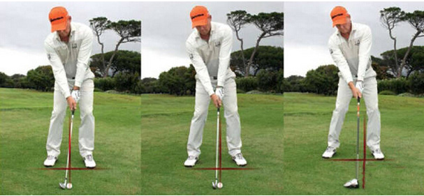 好的站位能够提高稳定性和灵活性。根据球杆不同,站位也是不同的。如果球杆比较短,站位需要窄一些,而如果球杆比较长,站位就要宽一些。还需要考虑球的位置,如图所示,用挖起杆时,球应该在站位的中间。而手拿一号木时,球就应该略偏向左脚后跟内侧(如果太偏左,挥杆时为了打到球,双肩会被过于放开)。