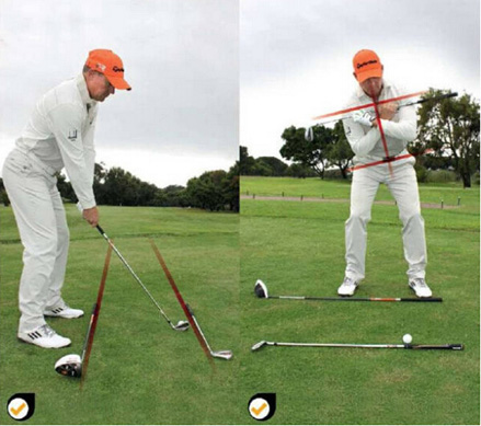 如要打出笔直飞向目标的球,除了杆面朝向目标,双脚、双膝、髋部及肩膀均应与目标线平行。为了确信正确地对齐了平行线,可以在球旁放一个球杆,并将它朝向目标方向。然后把另一个球杆放在双脚前。如果这两根球杆是平行的,就意味着你的双脚很好地处在了平行线上了。如下图左一所示。