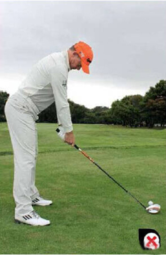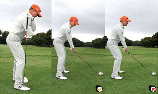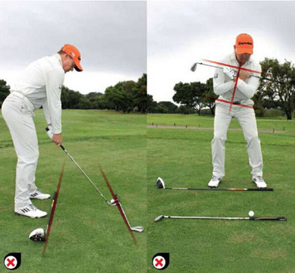 上图中错误的示范,右侧高于左侧,身体重心就会在前脚,从而导致起杆和下杆时要后转,会形成陡峭的挥杆轨迹。而右侧肩膀高会导致由外向内的挥杆轨迹,形成右曲球。