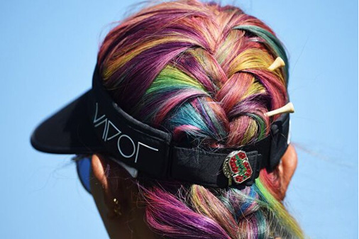 她将头发染成了五颜六色。让我们仔细看看,紫红、玫红、桃红、孔雀蓝、宝蓝、墨绿、草绿、亮黄……编织的一头麻花辫,各种颜色相互交错,看得都快色盲了。怎么样,你喜欢吗?