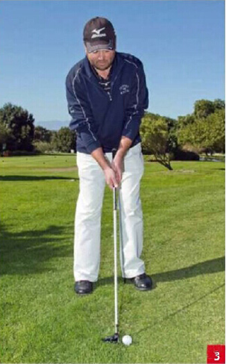 你的站位和握杆都要采用推杆的方式。因为球杆的长度问题,必须要向下握至杆身,这样才能形成好的站位。这时,正如推杆时一样,不需要什么手部动作,你要做的就是肩膀的转动。最后,保持低头,专注于击球。