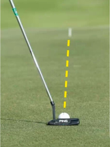然后,当你下场之前,在自己的球上画一条线。在果岭上摆球时,注意将这条线瞄向拐折的起点。当你准备推球的时候,这可以起到一个很好的参照作用,你可以根据这条线放置你的杆面并调整身体的方向,从而把洞杯转移出你的注意力当中。