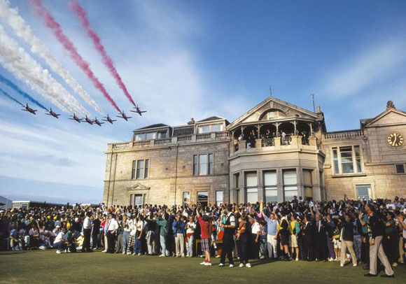 9、1990年英国公开赛捧起葡萄酒壶看飞机特技演出