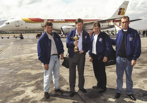 20、1997年莱德杯获胜后带着葡萄酒杯准备搭飞机离开西班牙