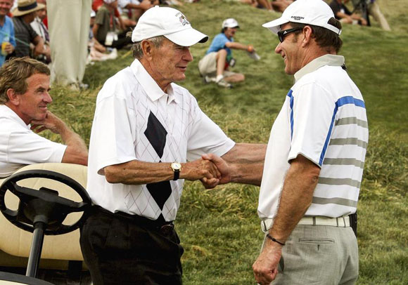 25、2008年莱德杯期间和美国前总统乔治·布什握手