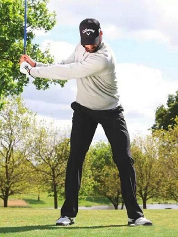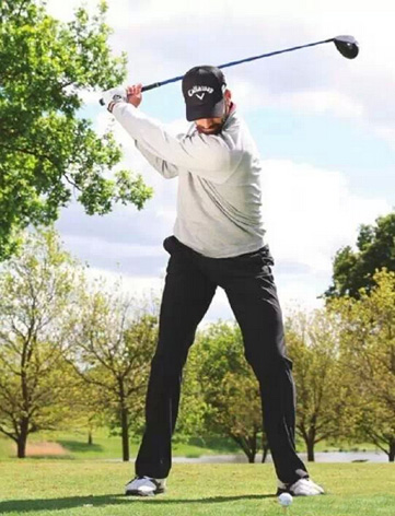 当奎罗斯上杆到顶点的时候,会发现他的杆身并没有到达与地面平行的程度,但这并不会影响他的挥杆速度,因为他的肩膀已经完全转过来,并且背部指向目标方向。