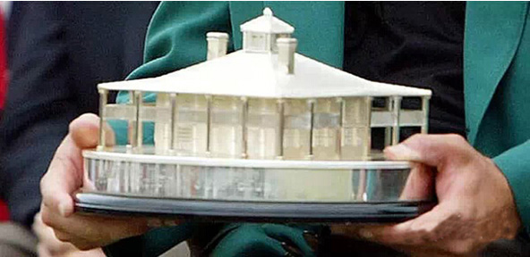 我们知道每年大师赛的冠军会穿上那件著名的绿夹克,但却很少有人知道冠军还会获得一座奖杯和一个奖牌。大师赛的奖杯是奥古斯塔俱乐部会所的形状,制作于1961年并被永久保存在俱乐部会所中。从1993年开始,每届冠军都会被颁发一个纯银复刻版的奖杯。