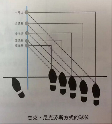 克-尼克劳斯式的球位是指左脚保持固定,右脚随球杆号数的变小往右移来确定球位的方法。同时球杆杆号越小,右脚越往后移,采取关闭式站姿;杆号越大,右脚与越往前移,采取开放式站姿。